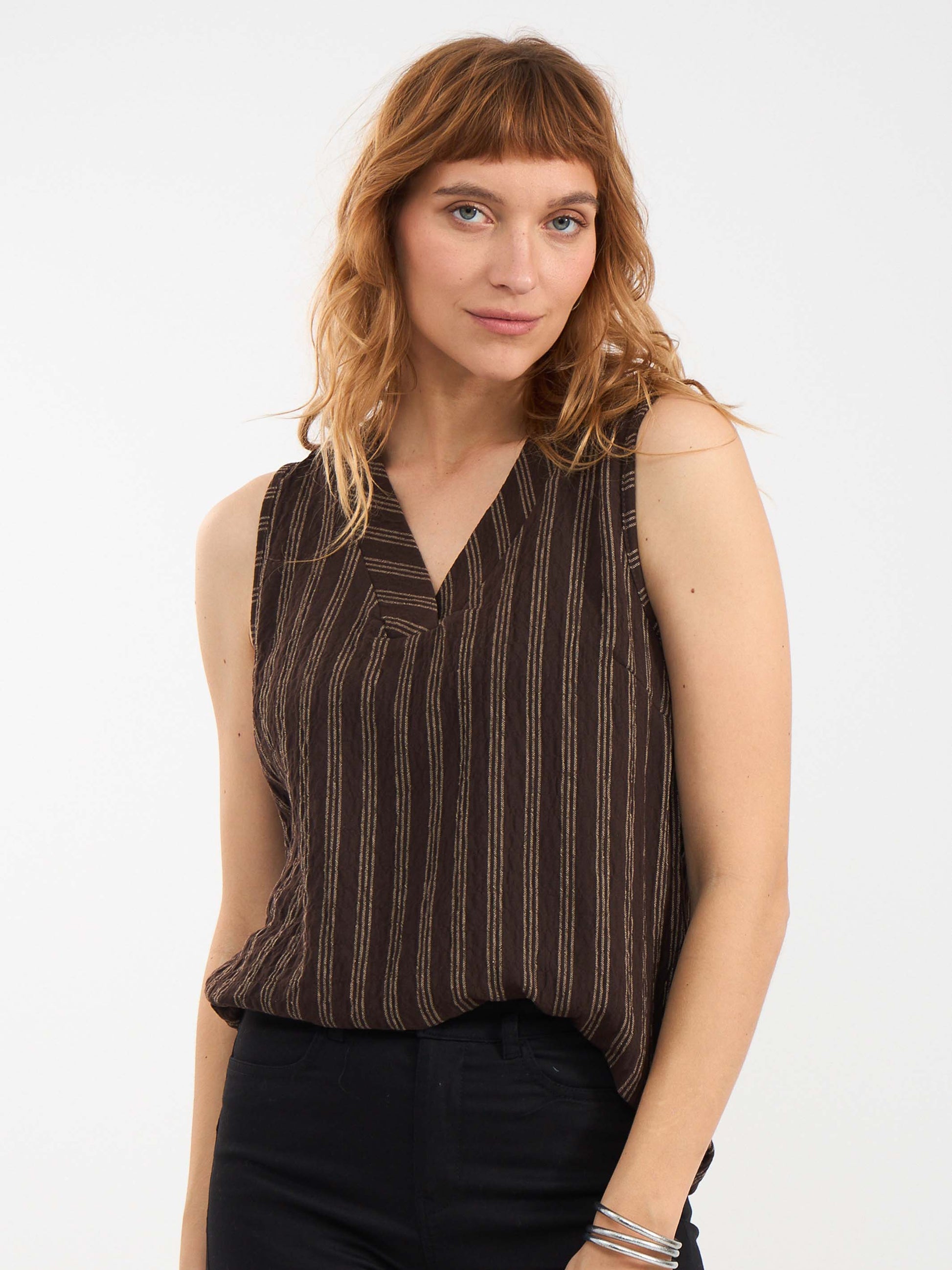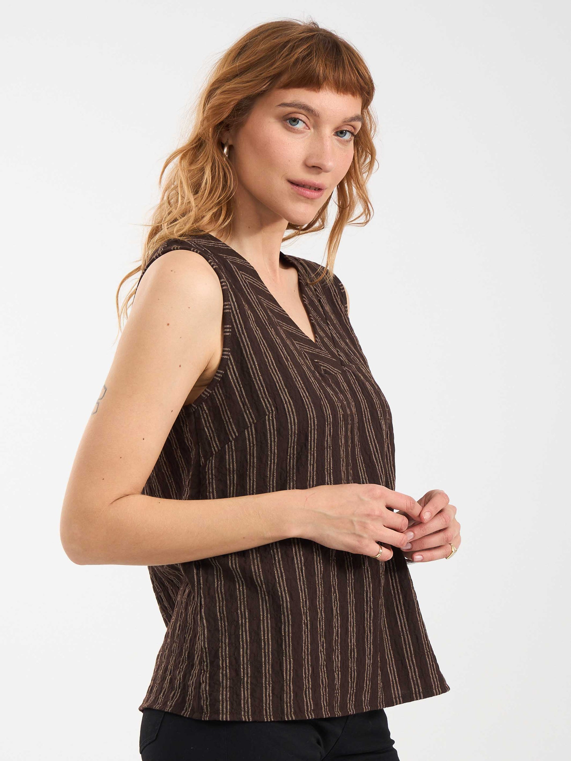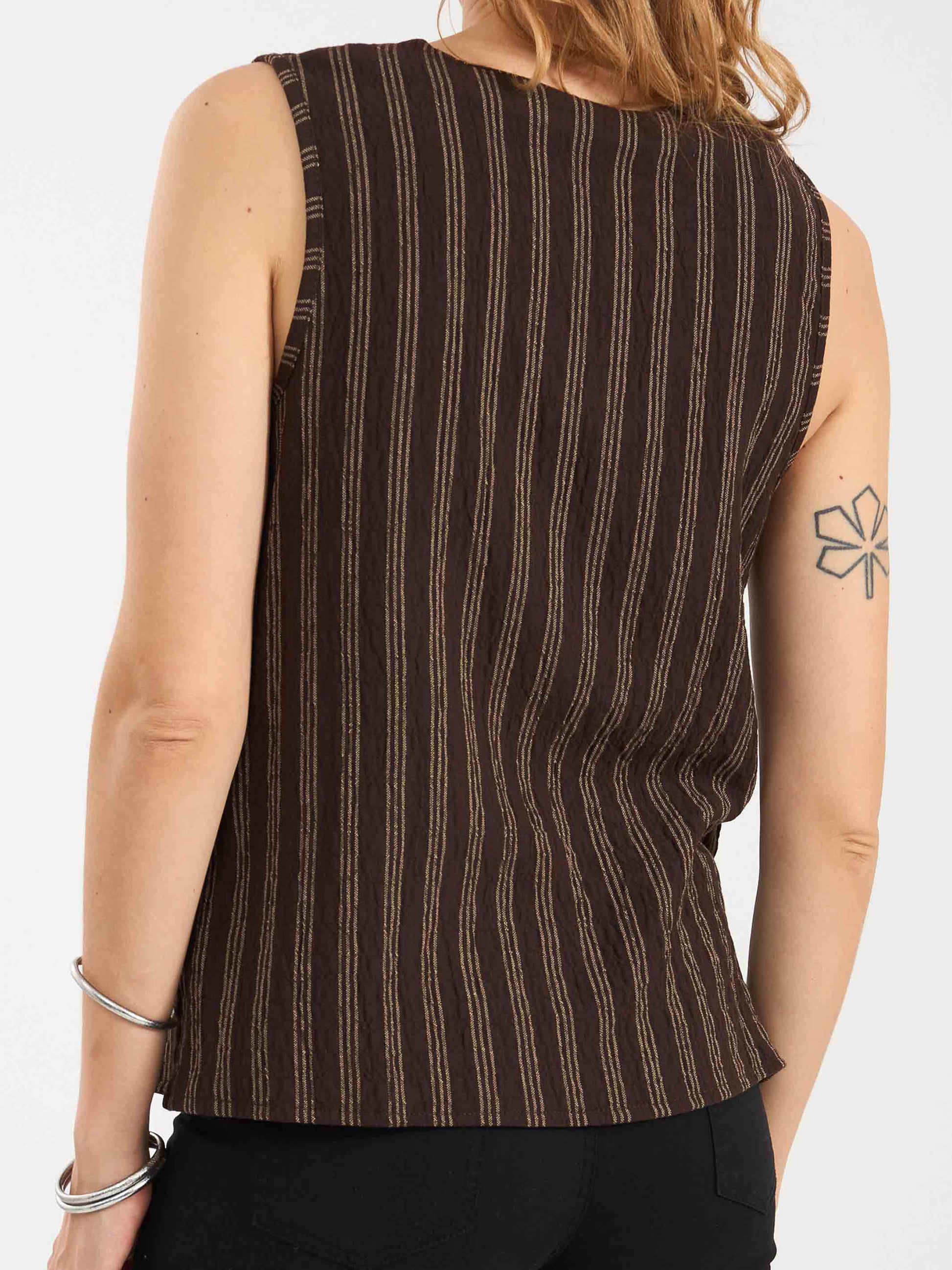 חולצה ללא שרוול מבד אריג פסים עם קימוט קל, בטקסטורת דמוי פשתן. לחולצה מפתח וי מחמיא.