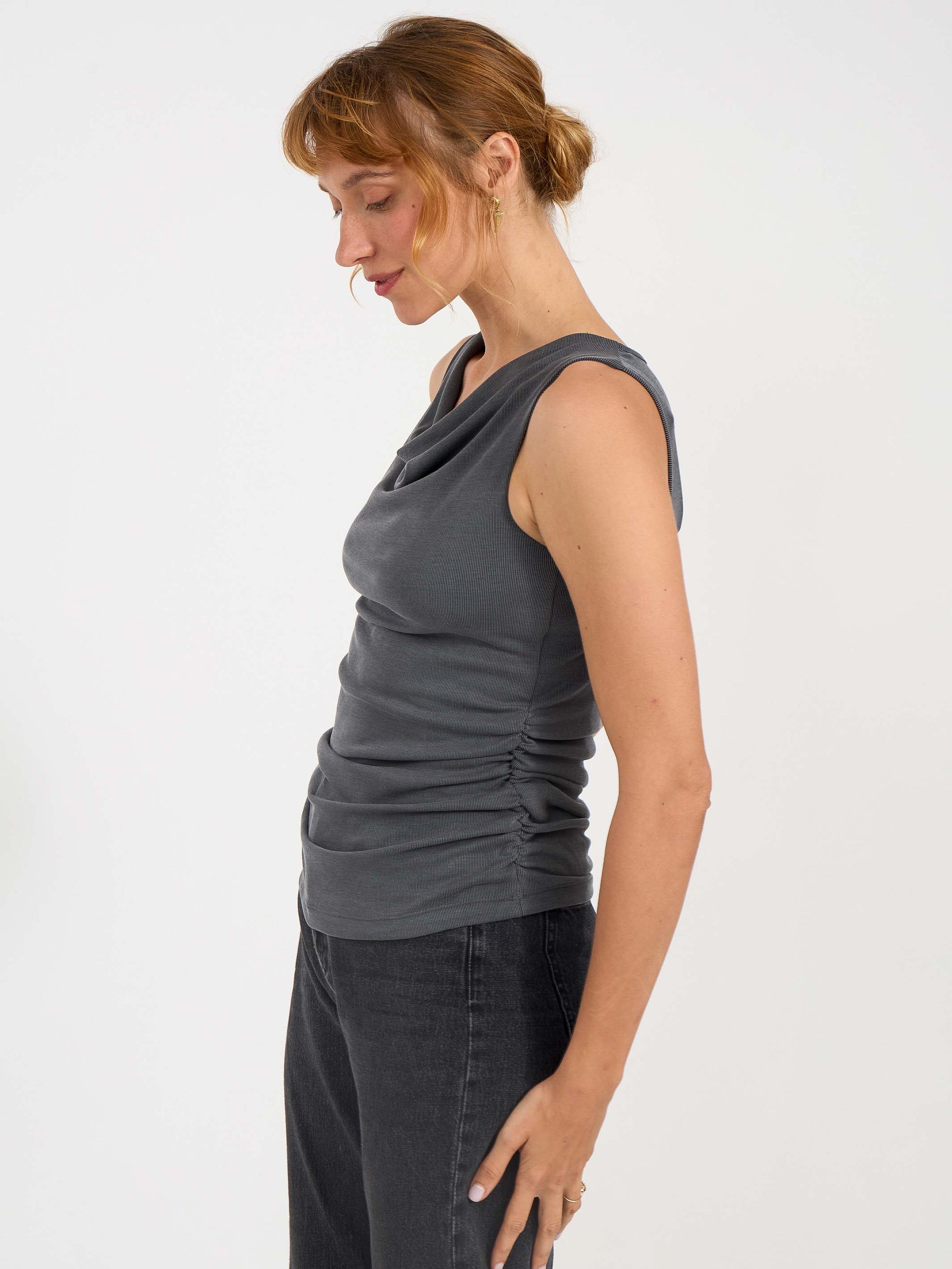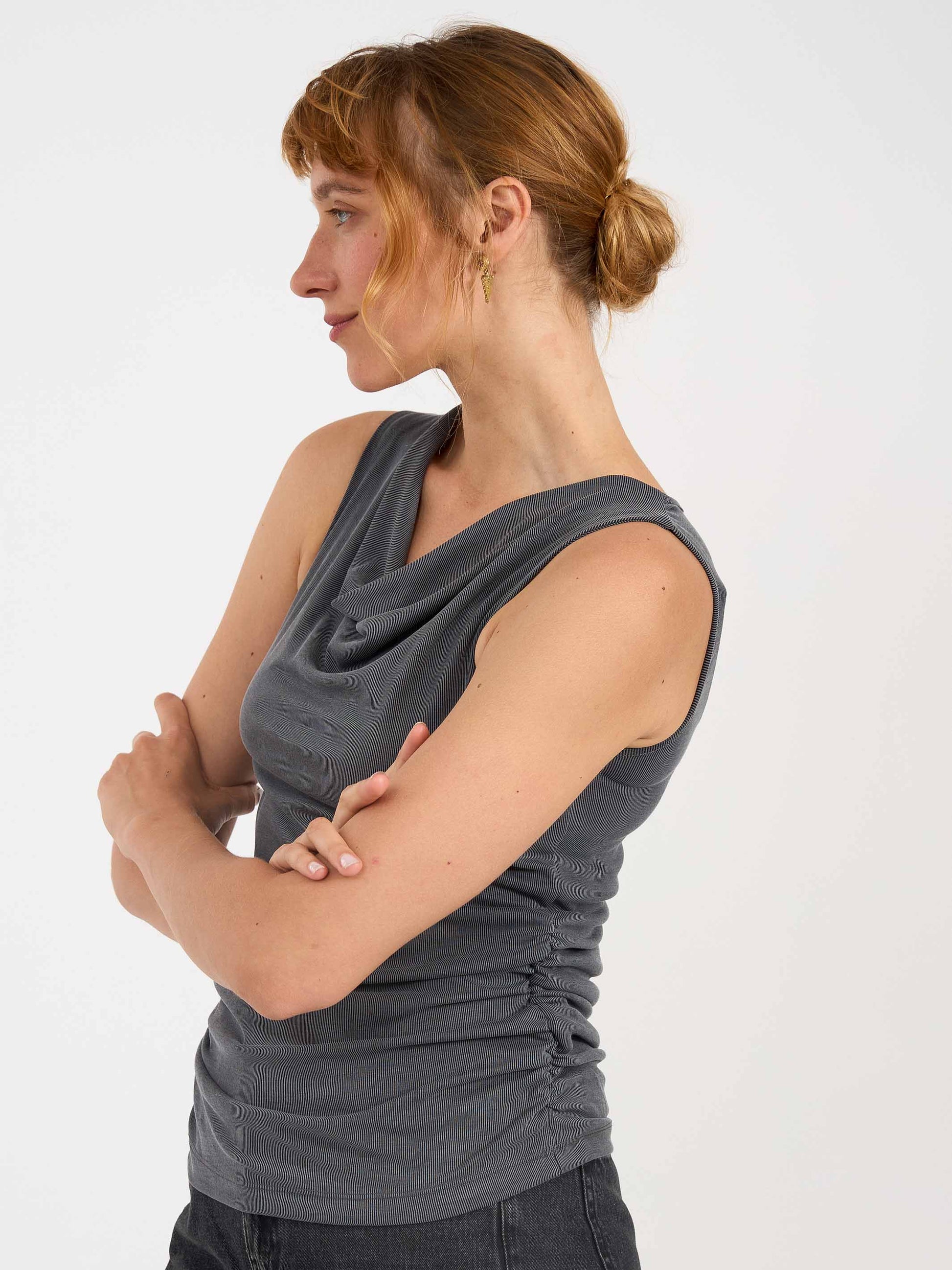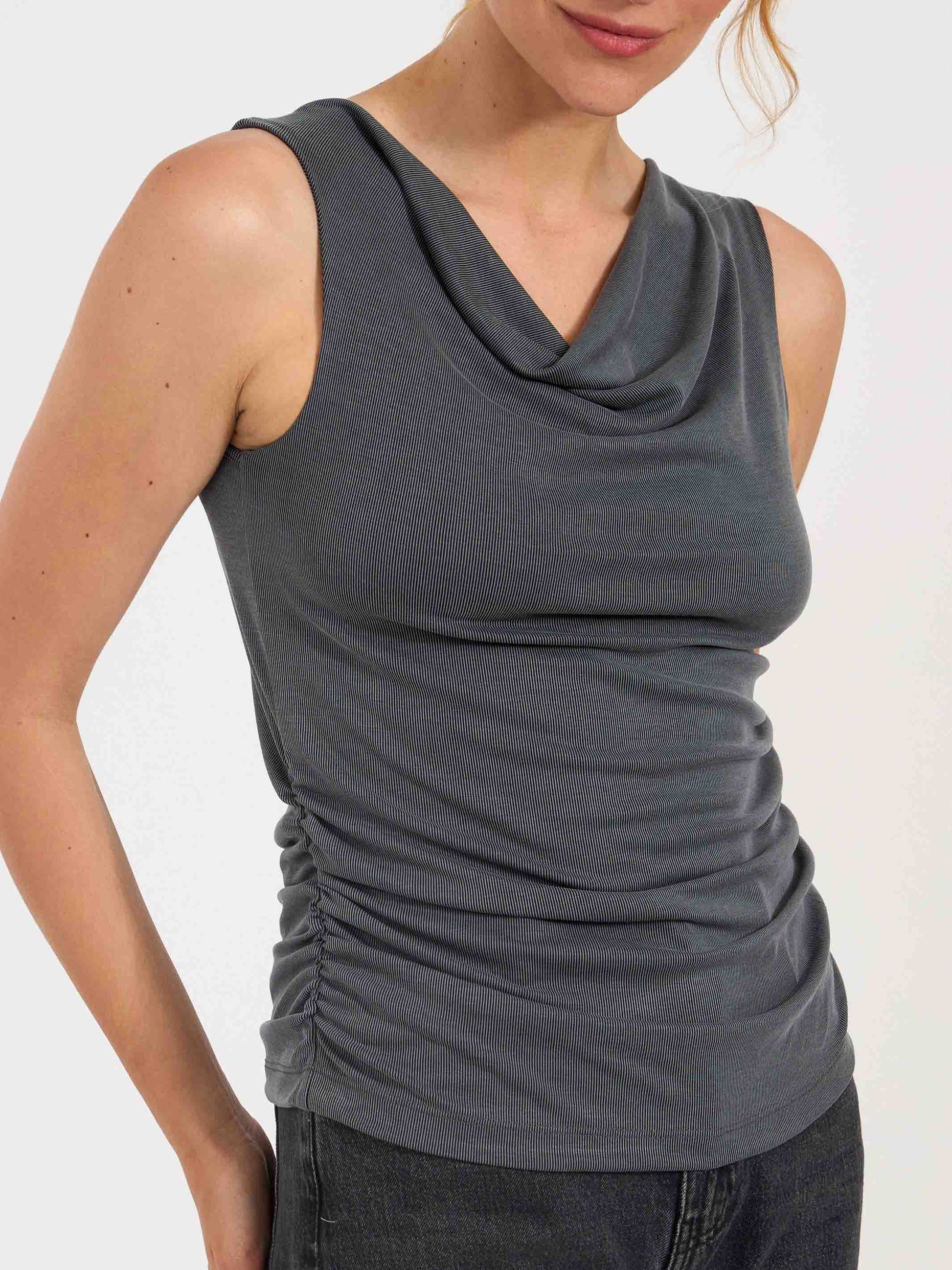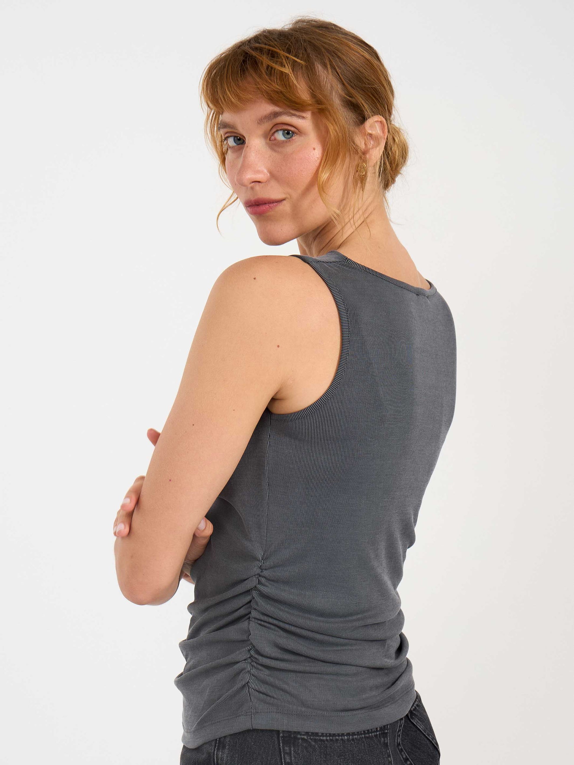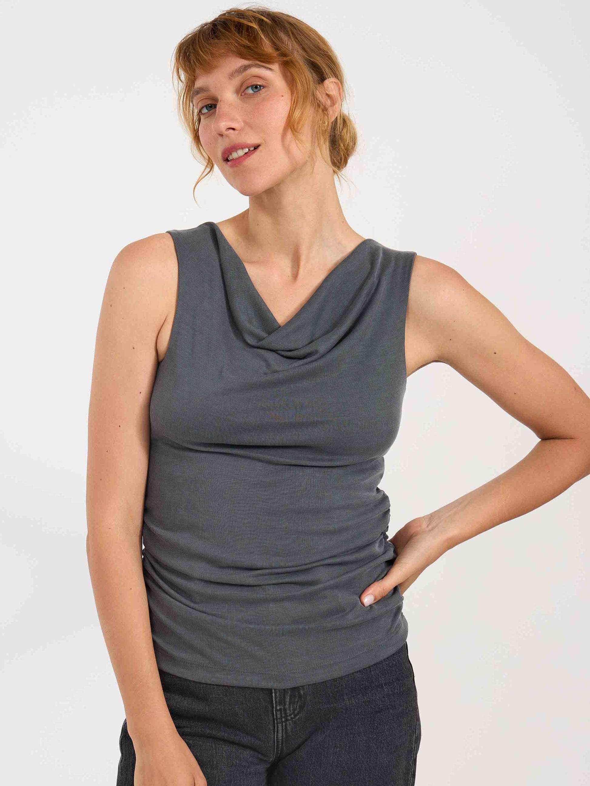 גופייה עשוייה בד רך ונעים למגע בעיצוב נשי ומחמיא. צאוורון רבידה עם מחשוף קל ועדין. מכפלת עגולה המדגישה את מראה הקימורים של גוף האישה. . כיווצים בצדי הגופייה שיוצרים עודפי בד קלים לאיזור הבטן. מטשטשים ונותנים תחושה נינוחה בלבישת הפריט