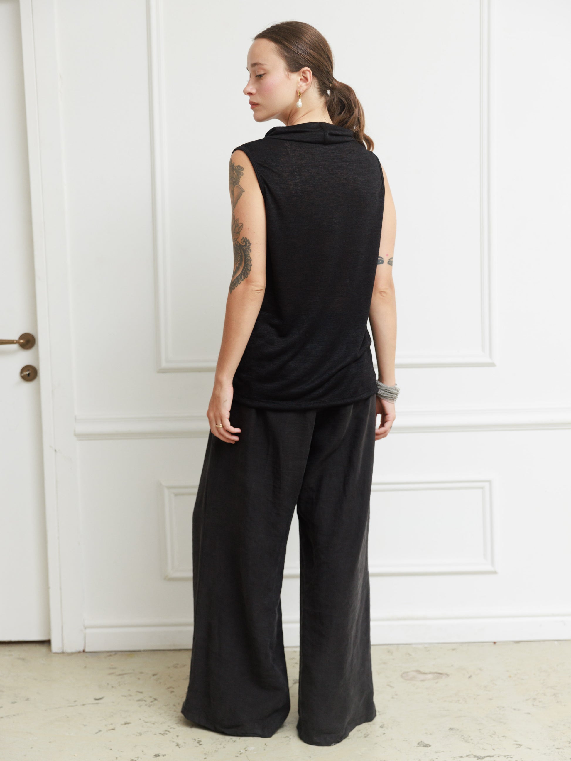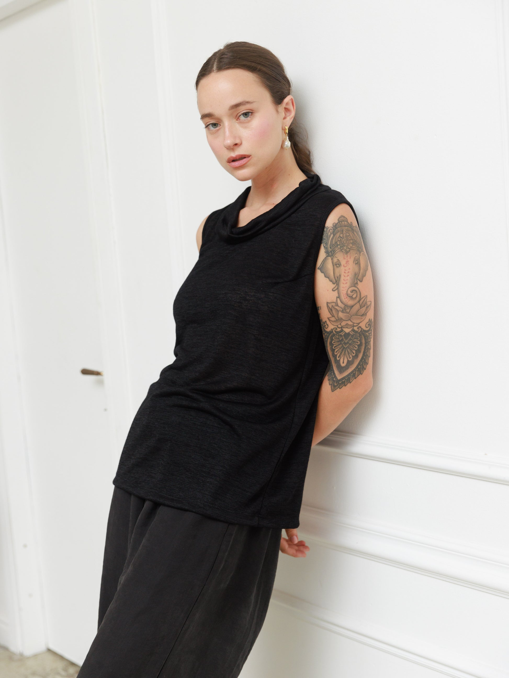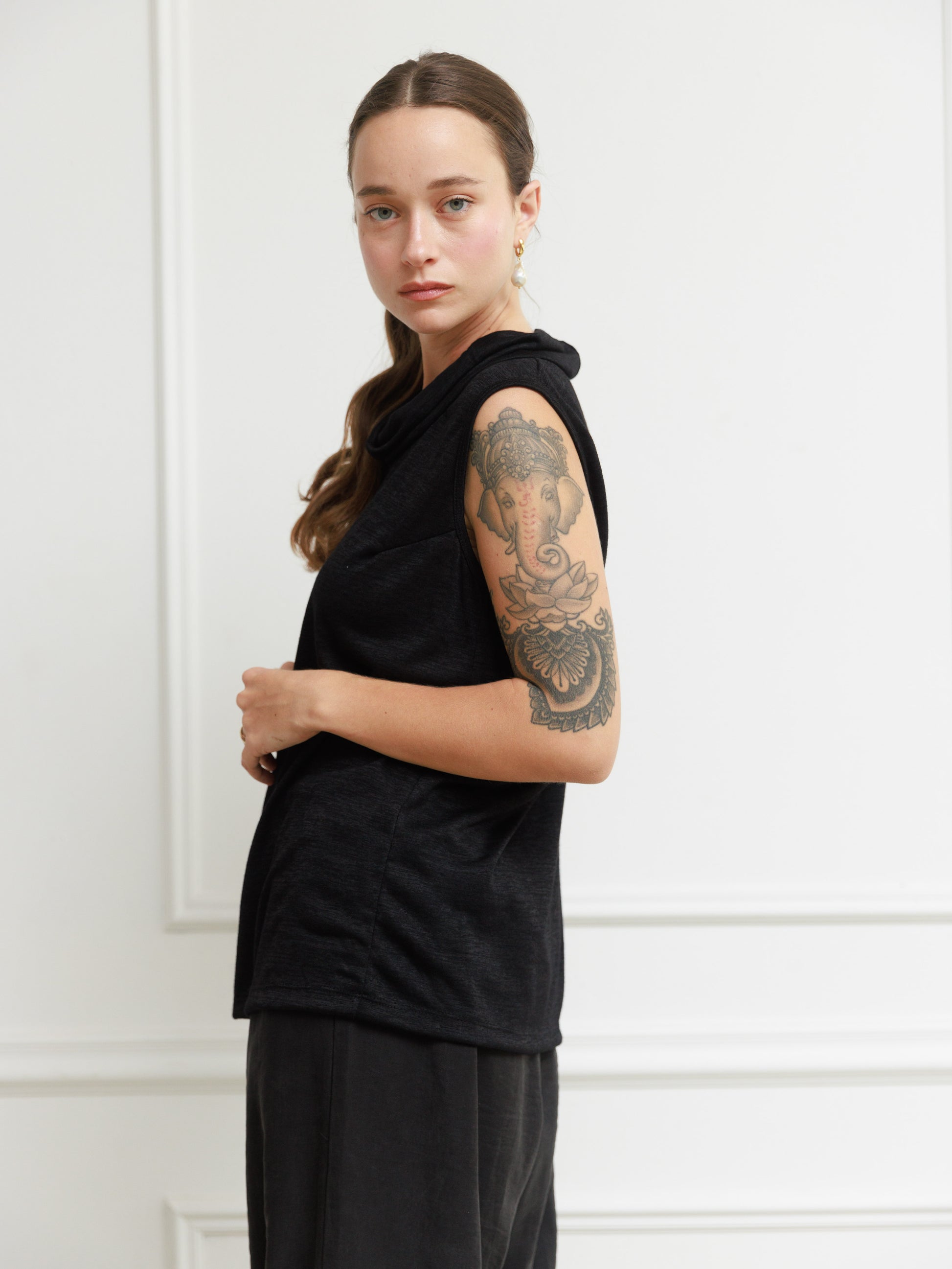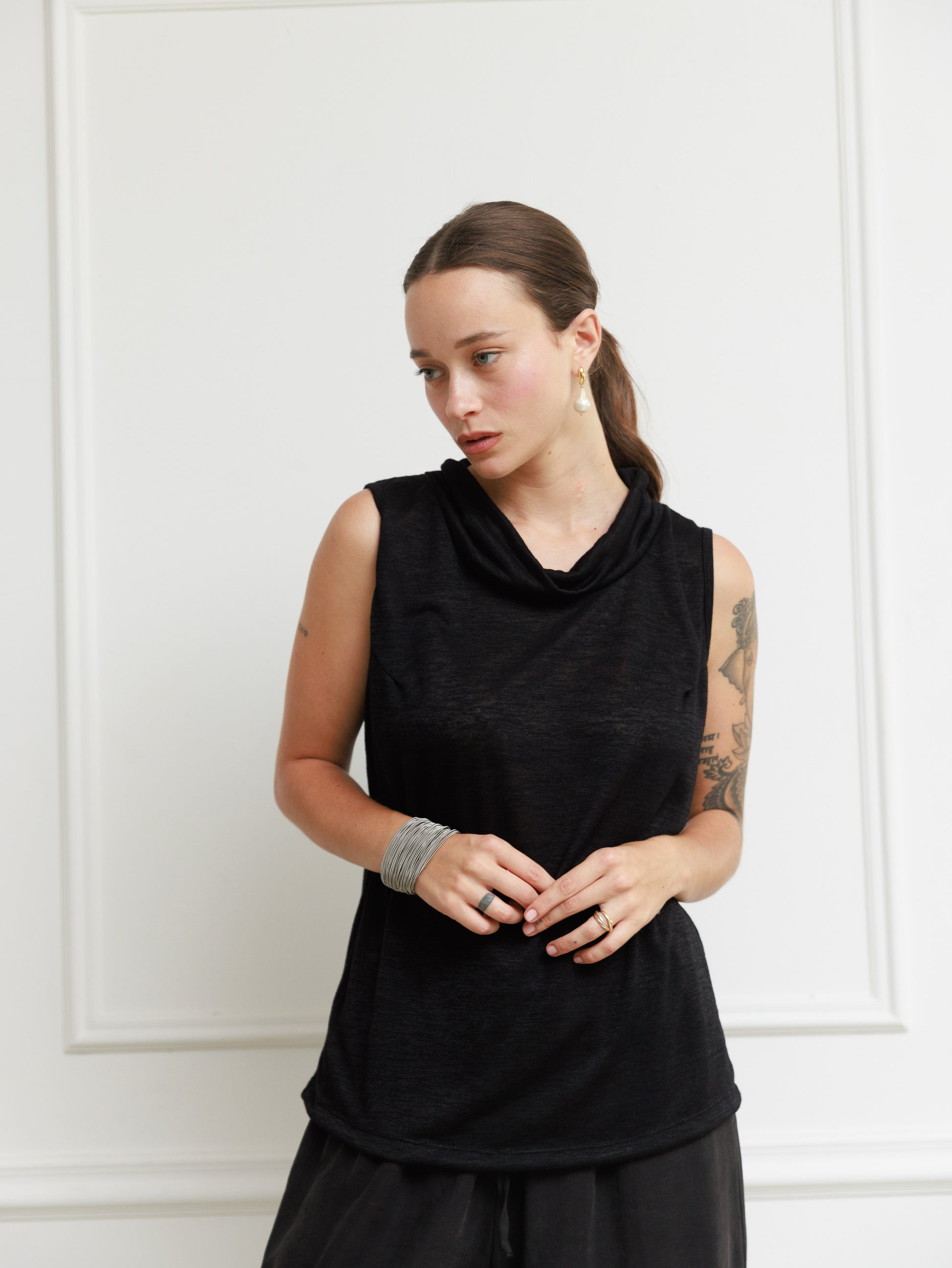 חולצה ללא שרוול מחמיאה וקלילה עם צווארון משתפל. עשויה מבד סלאב איכותי. החולצה מצוינת גם כפריט בייסיק קז'ואל לשילוב מתחת לג'קט או עליונית. הבד בעל שקיפות קלה.