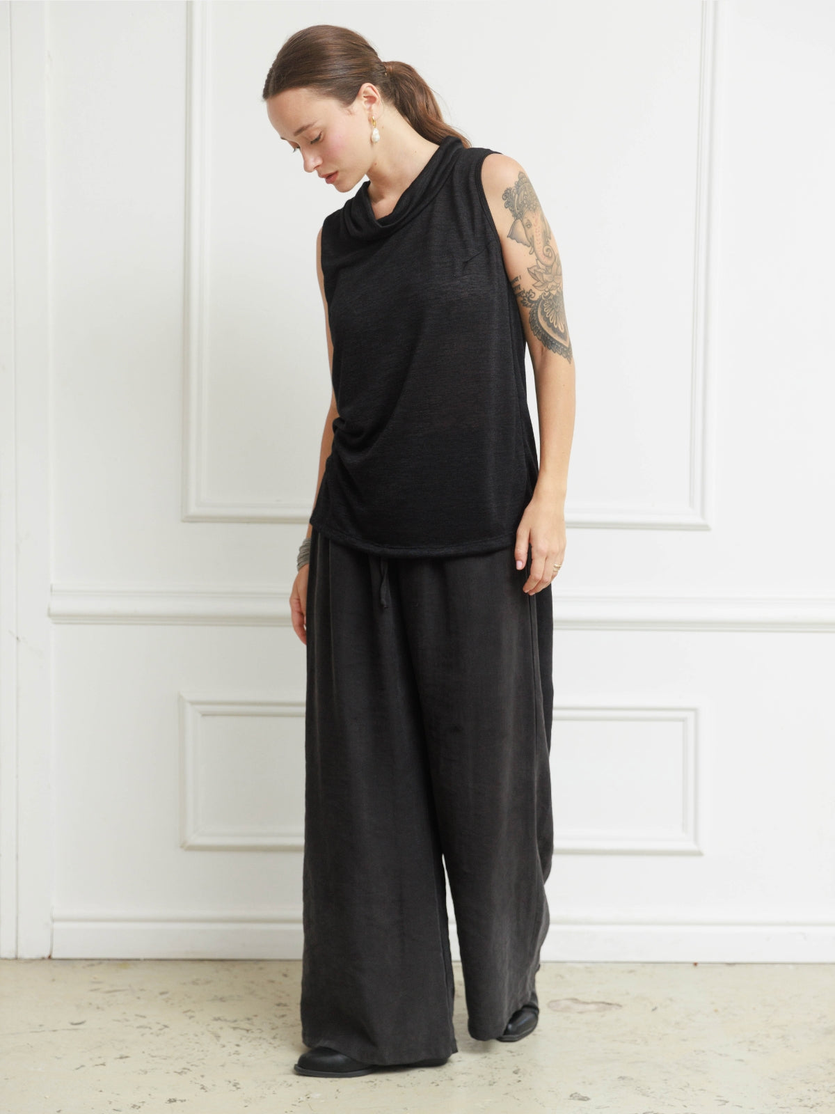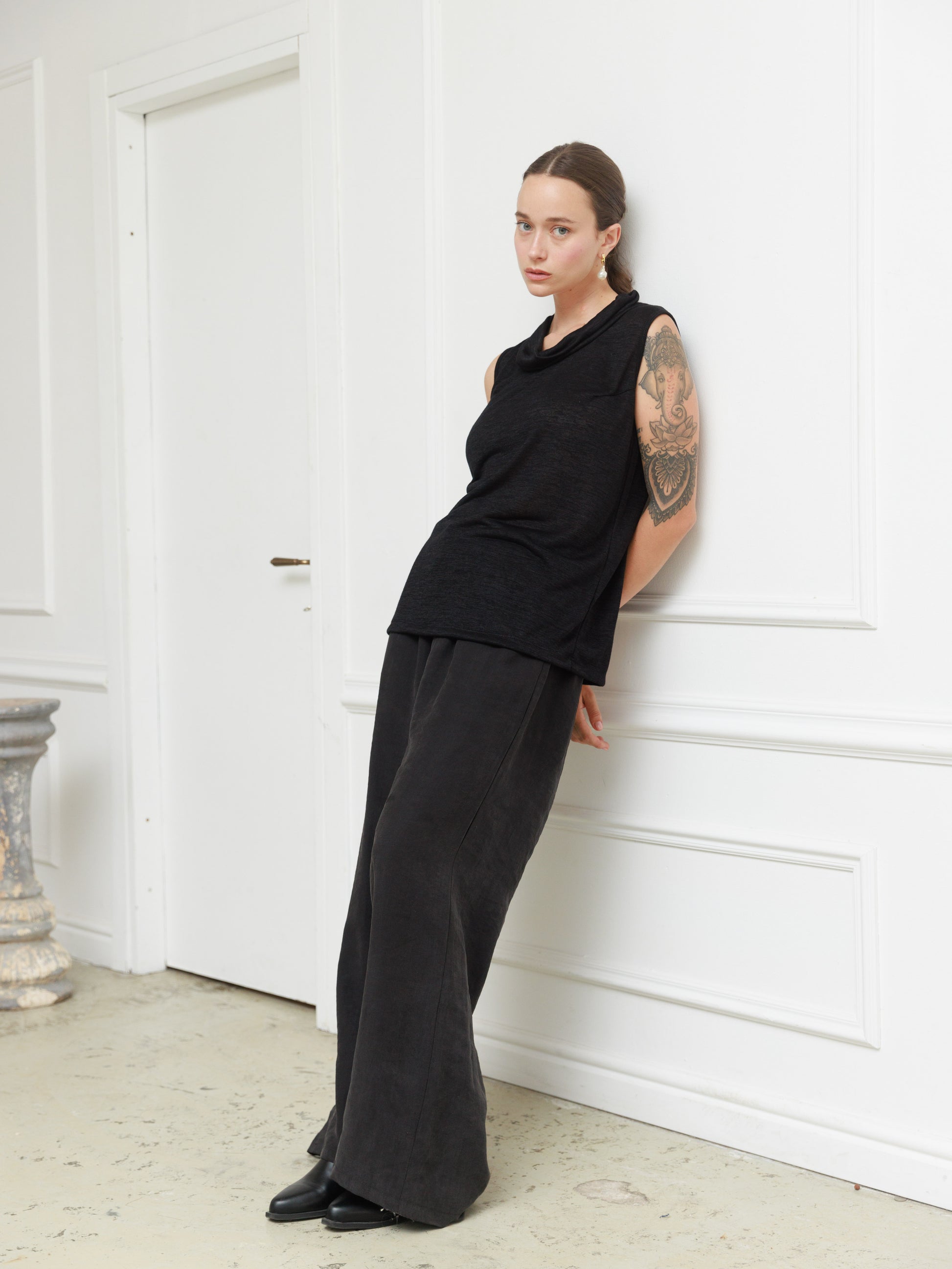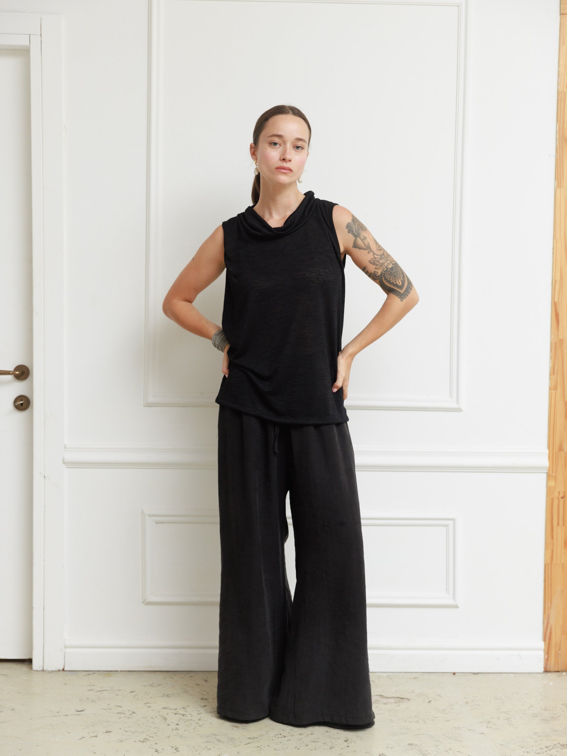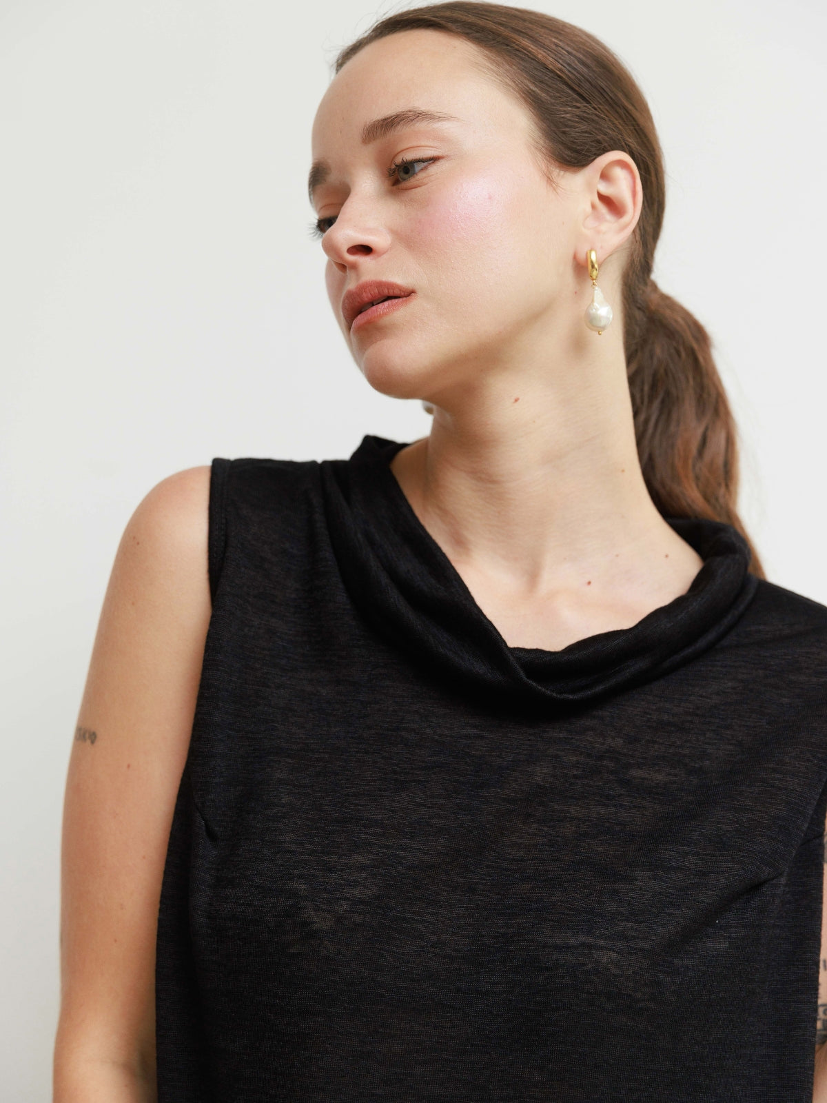 חולצה ללא שרוול מחמיאה וקלילה עם צווארון משתפל. עשויה מבד סלאב איכותי. החולצה מצוינת גם כפריט בייסיק קז'ואל לשילוב מתחת לג'קט או עליונית. הבד בעל שקיפות קלה.