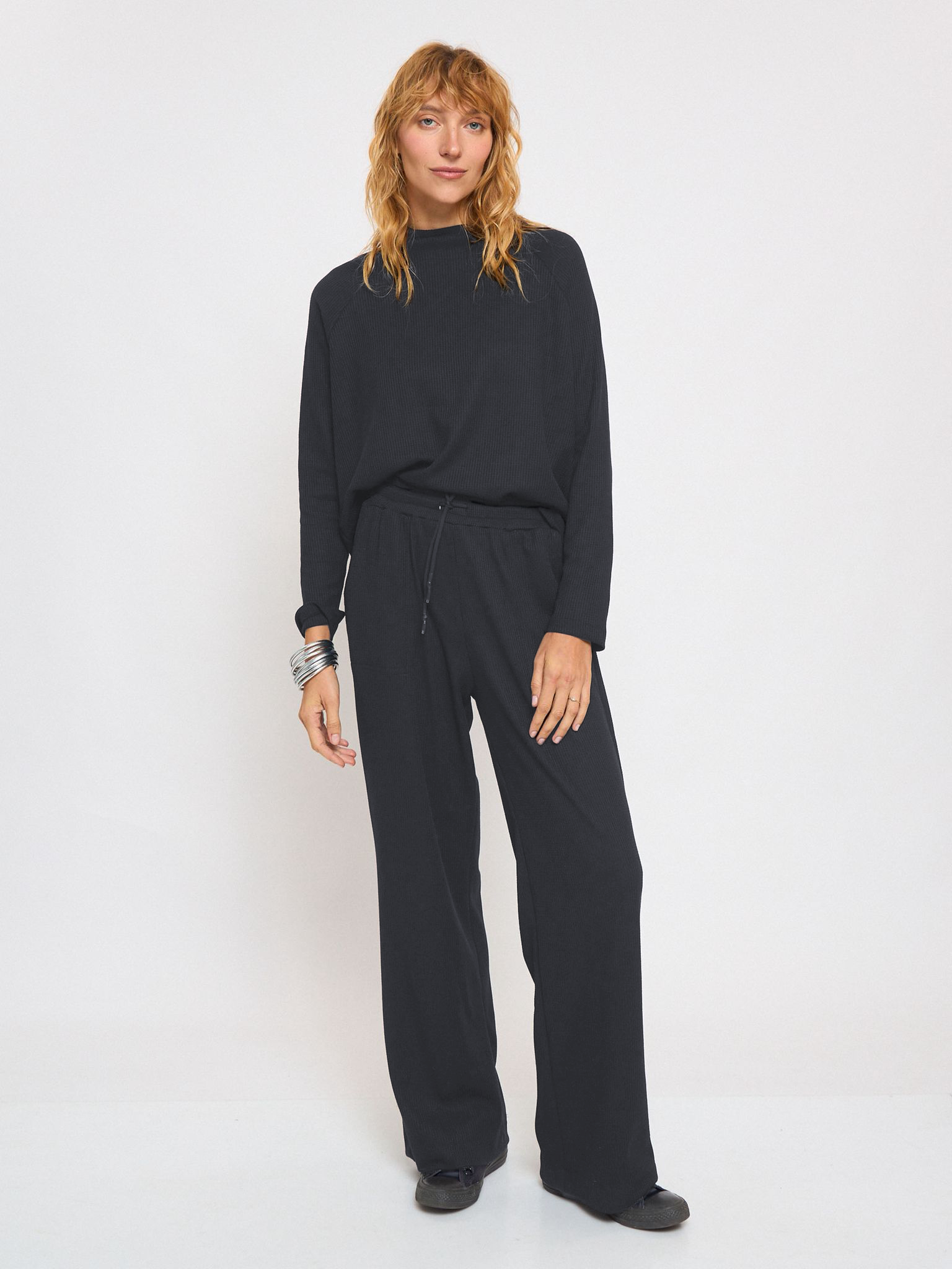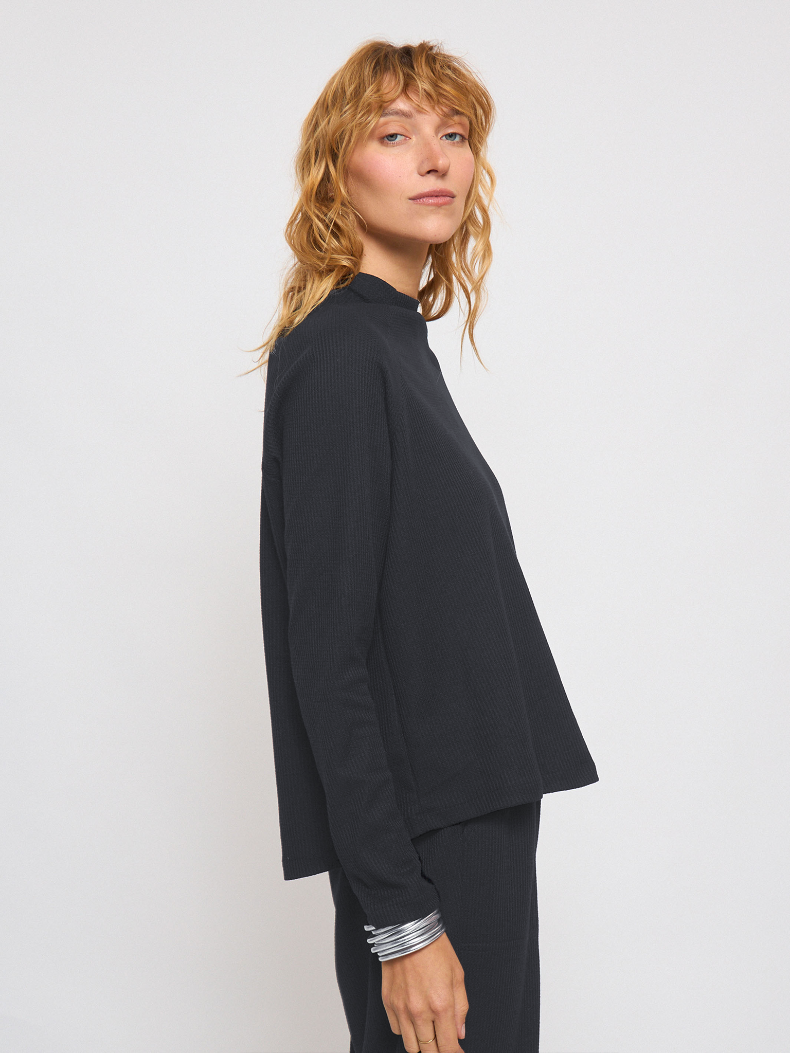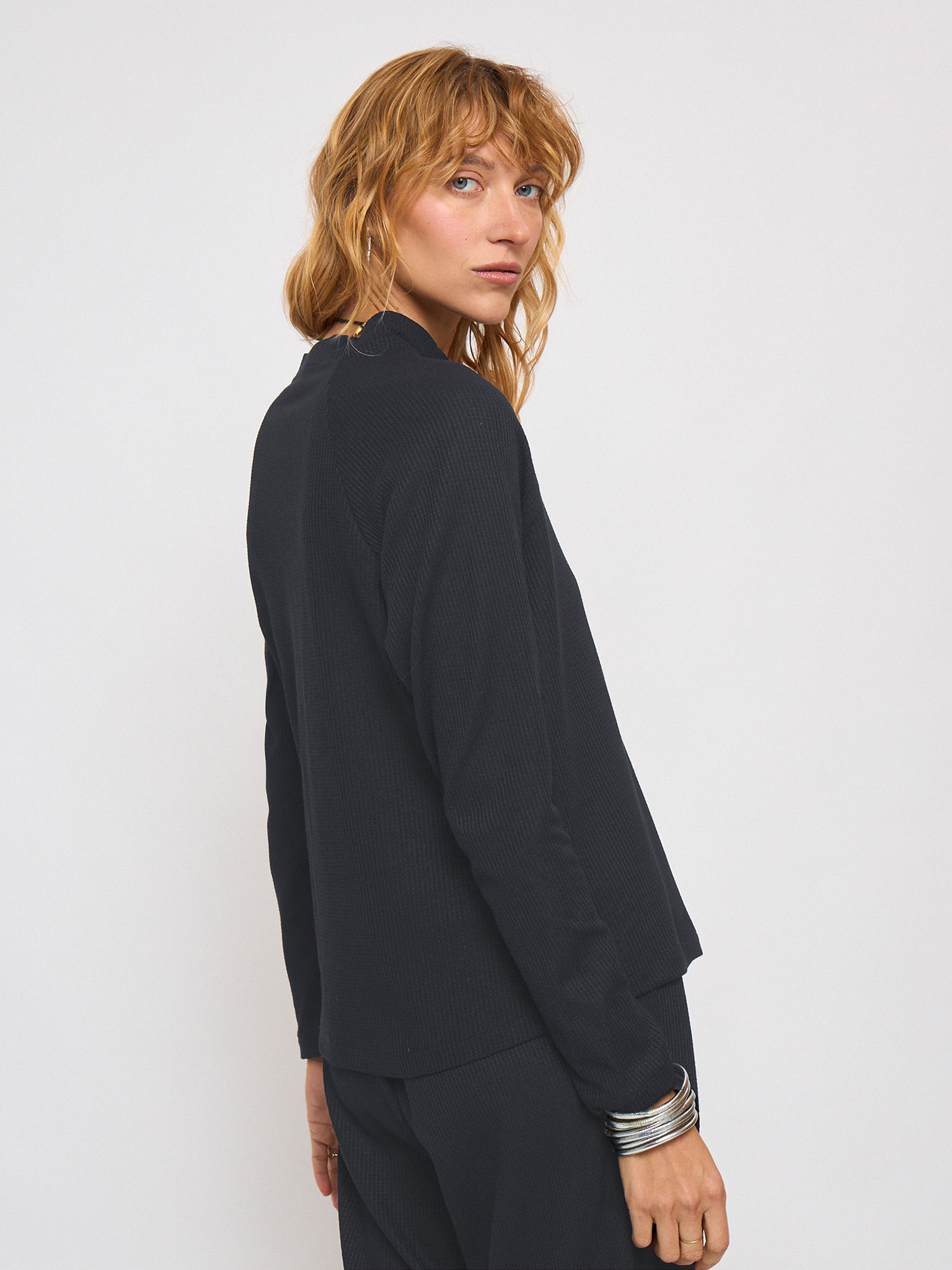 חולצה עשויה בד וופל נעים ורך. לחולצה שרוולי רגלאן וצווארון מעט גבוהה. חולצה עם מרקם שתרצי ללבוש כל היום בשילוב גזרה שתגרום לך להראות הכי טוב במינימום מאמץ. הפריט בגזרה רחבה ונעימה. עיצוב ייחודי, נוח עם מראה קלאסי המתאים עם מגוון לוקים.