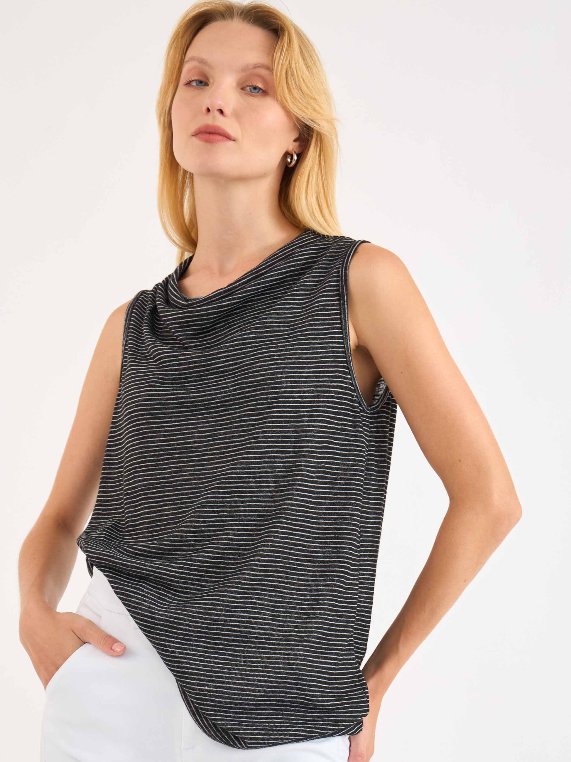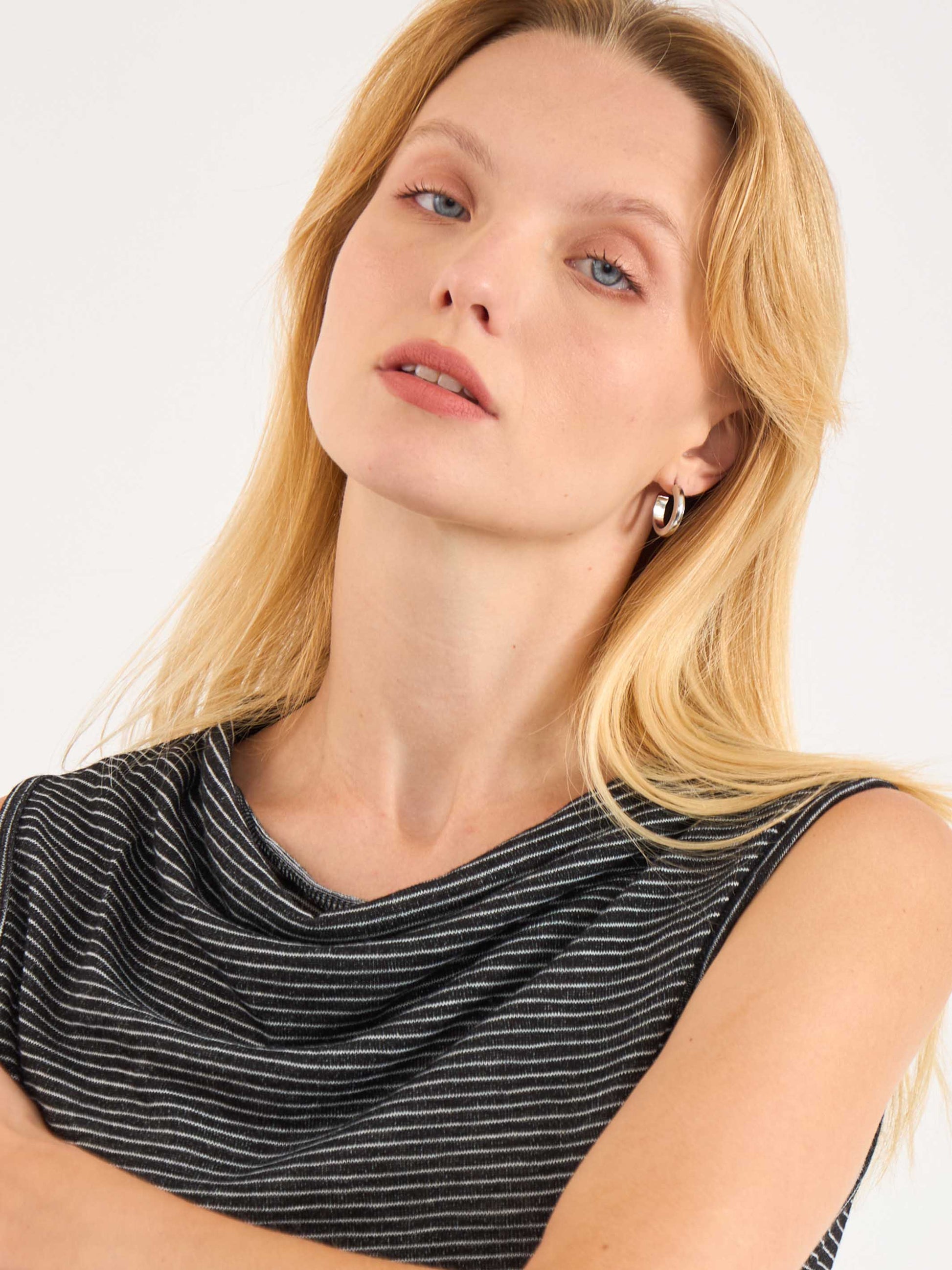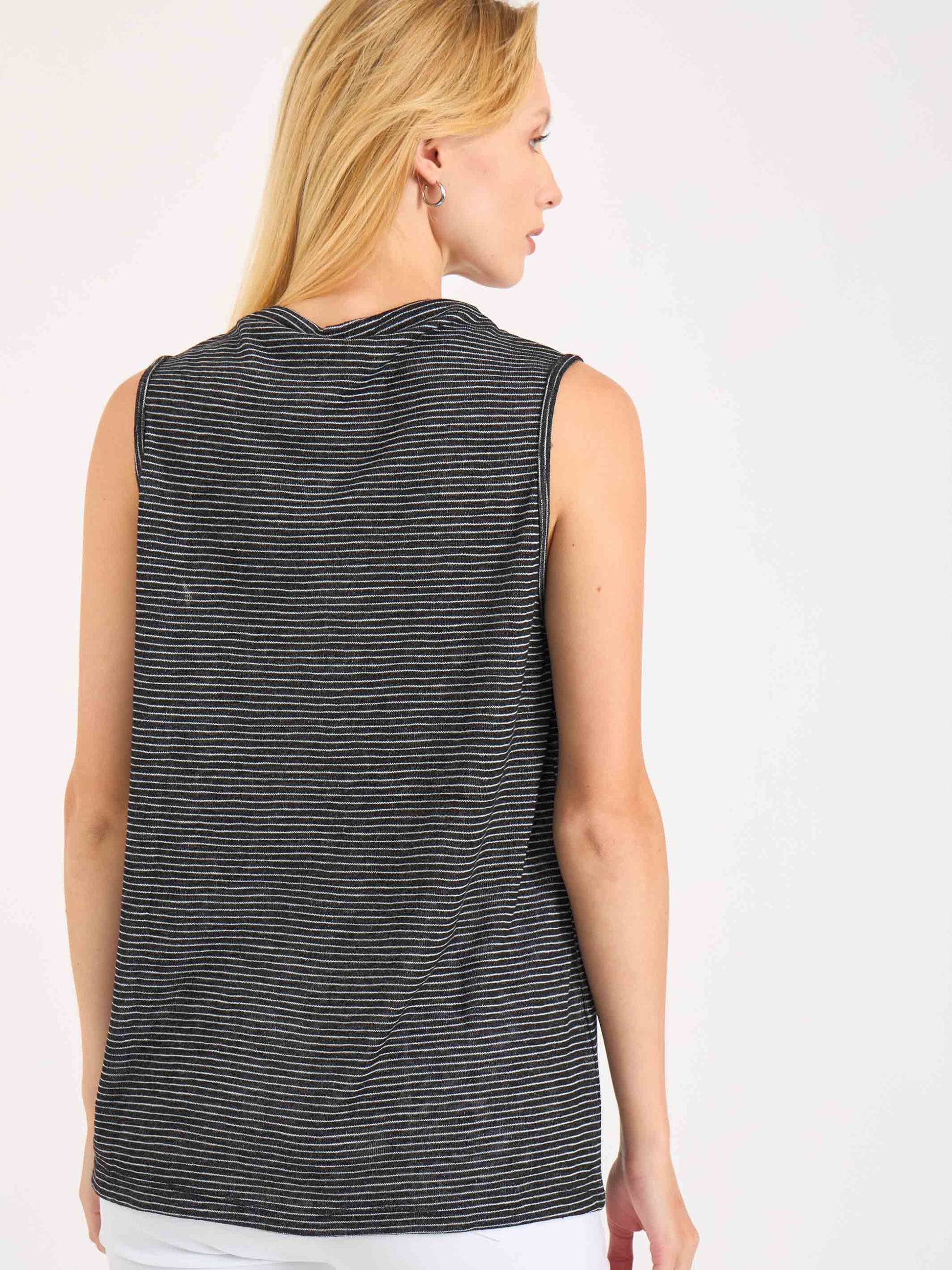 חולצה מבד סריג מפוספס ללא שרוול.החולצה בגזרת צווארון משתפל קלות, מבד נעים וגזרה מרווחת לנוחות מירבית. מצוינת כפריט מתחת לחלקים עליוניים כמו ג'קט ועליוניות.
