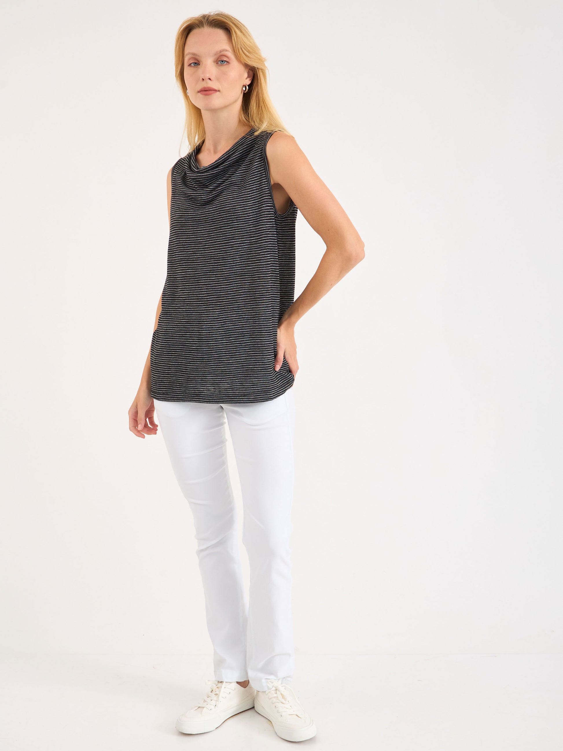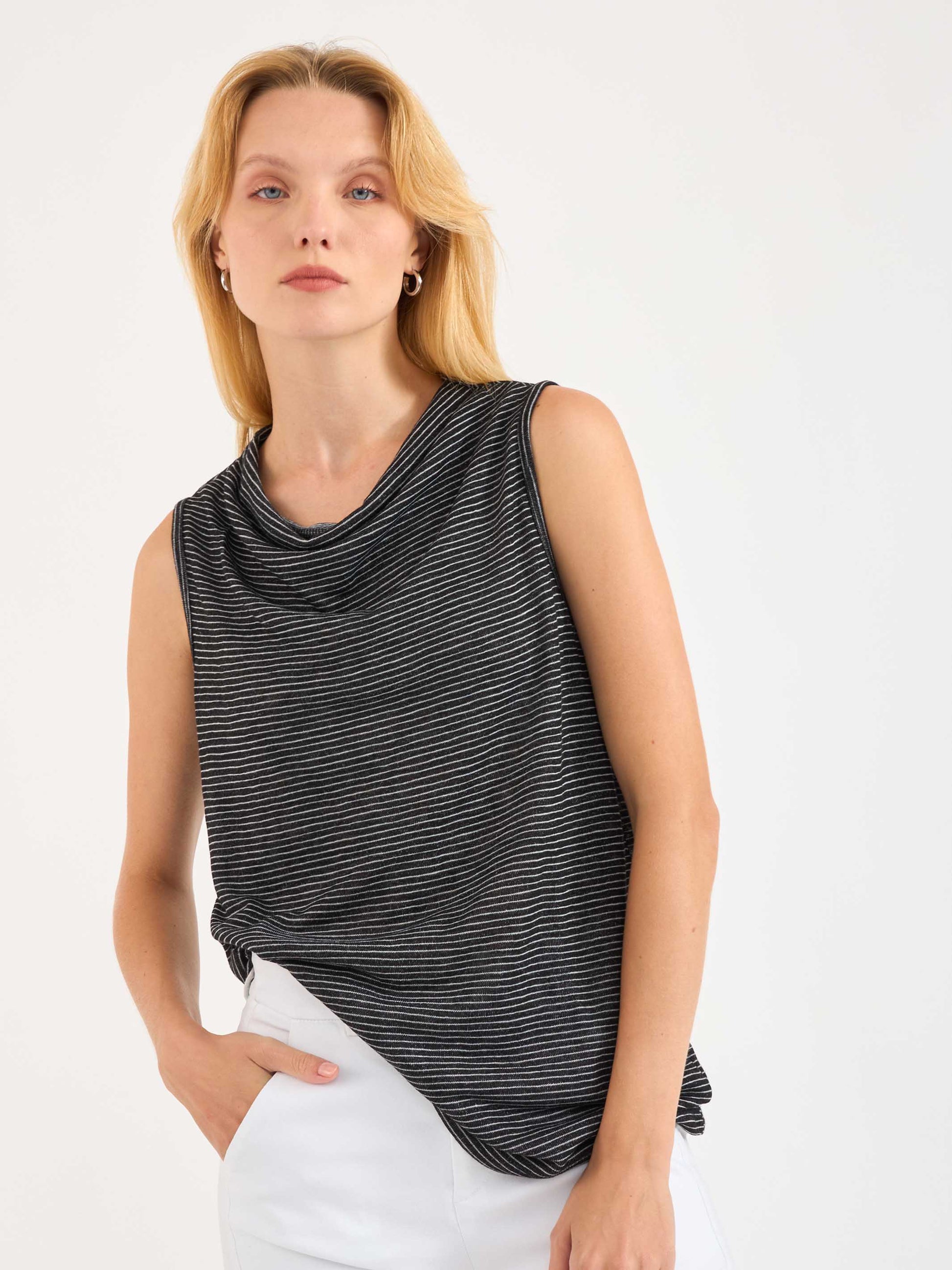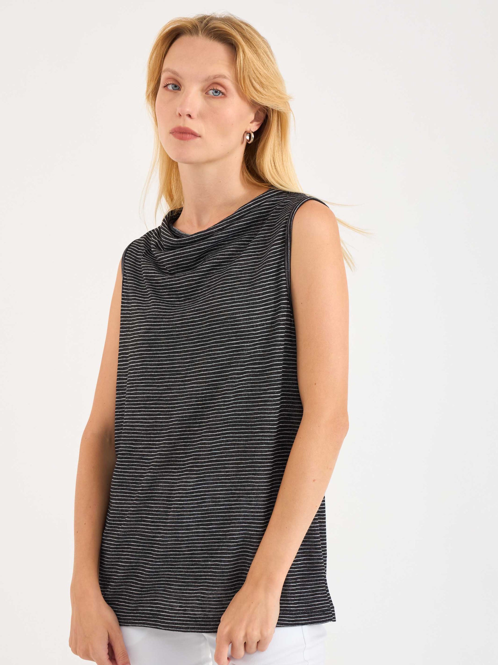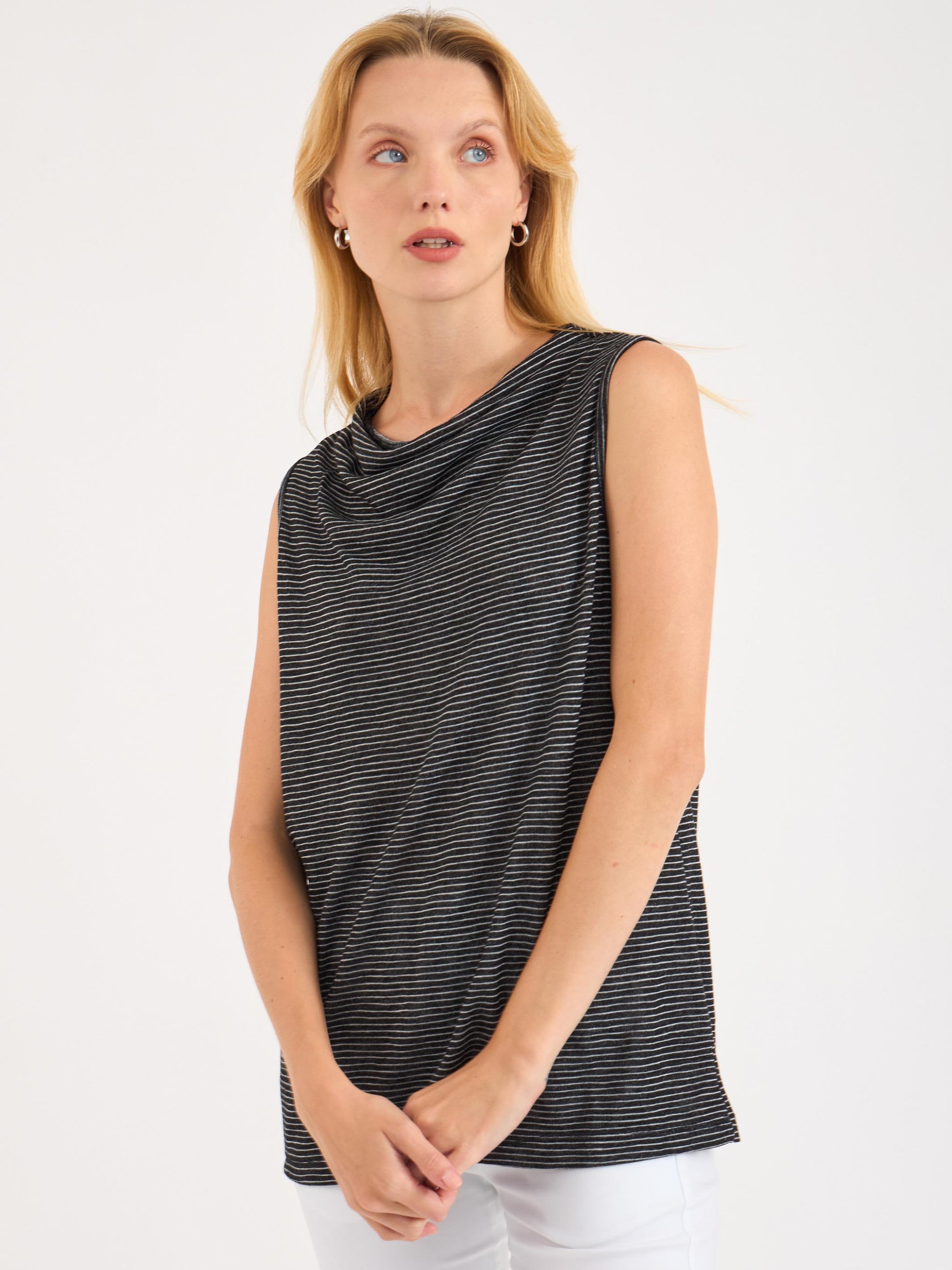 חולצה מבד סריג מפוספס ללא שרוול.החולצה בגזרת צווארון משתפל קלות, מבד נעים וגזרה מרווחת לנוחות מירבית. מצוינת כפריט מתחת לחלקים עליוניים כמו ג'קט ועליוניות.