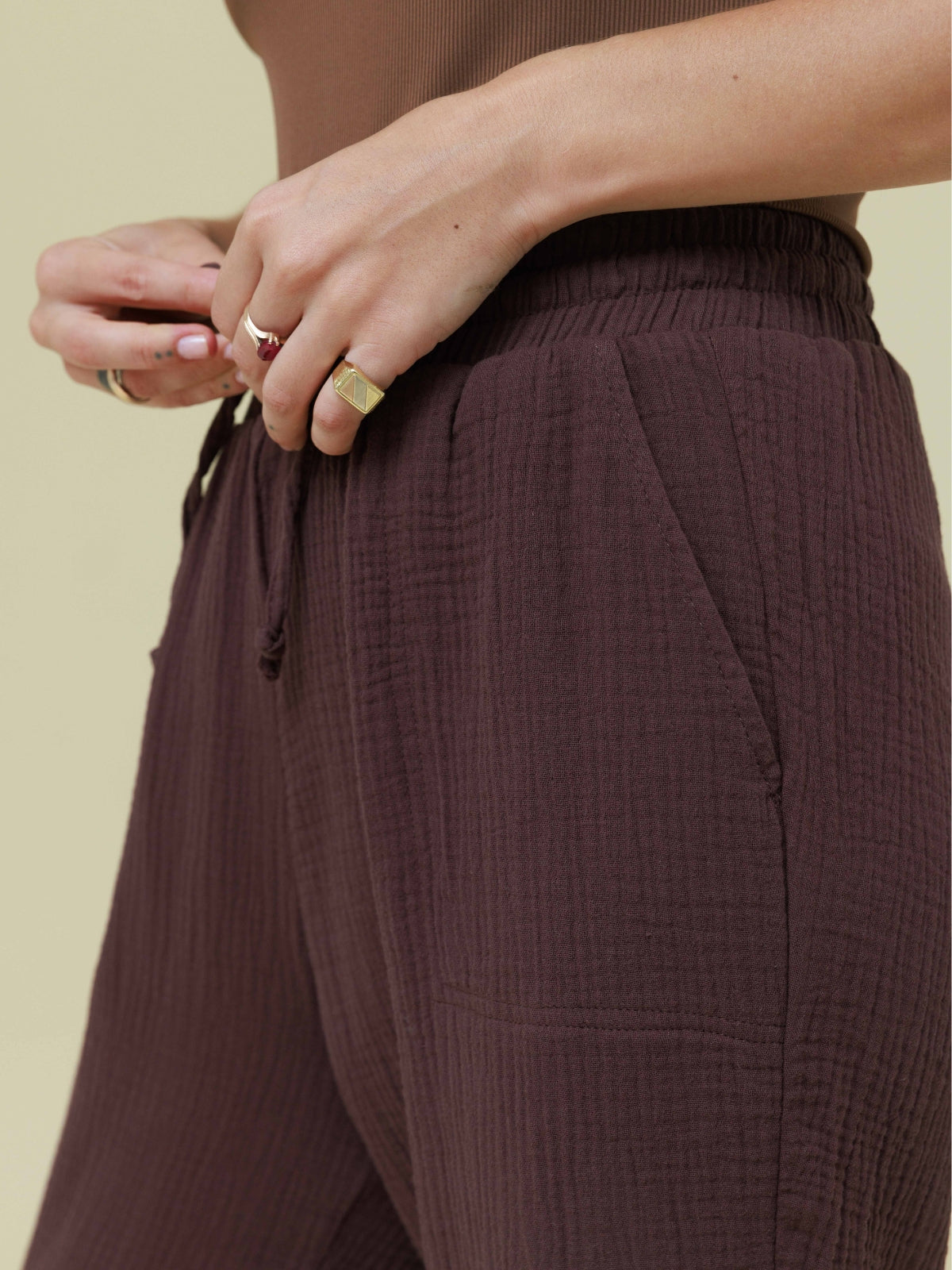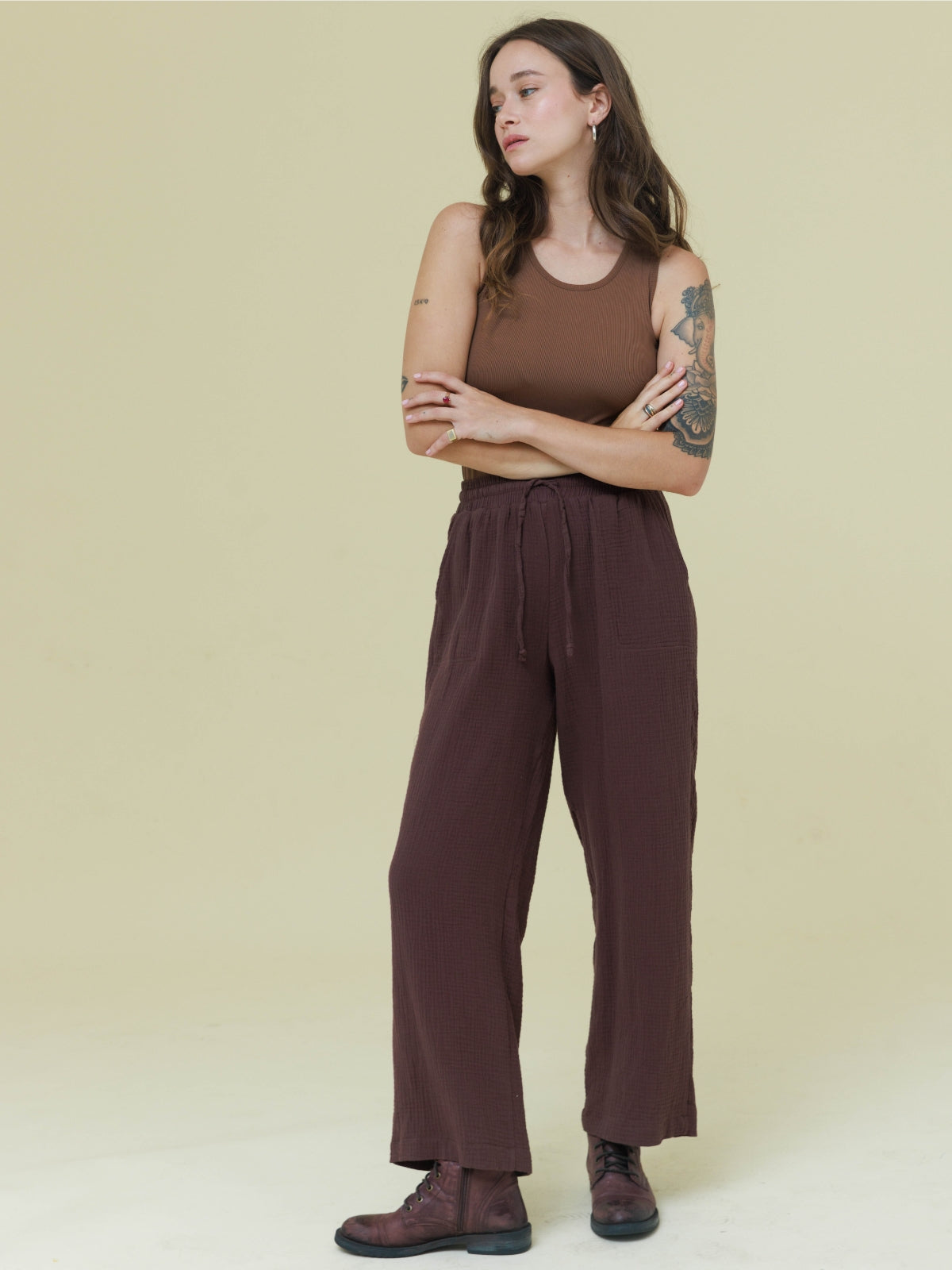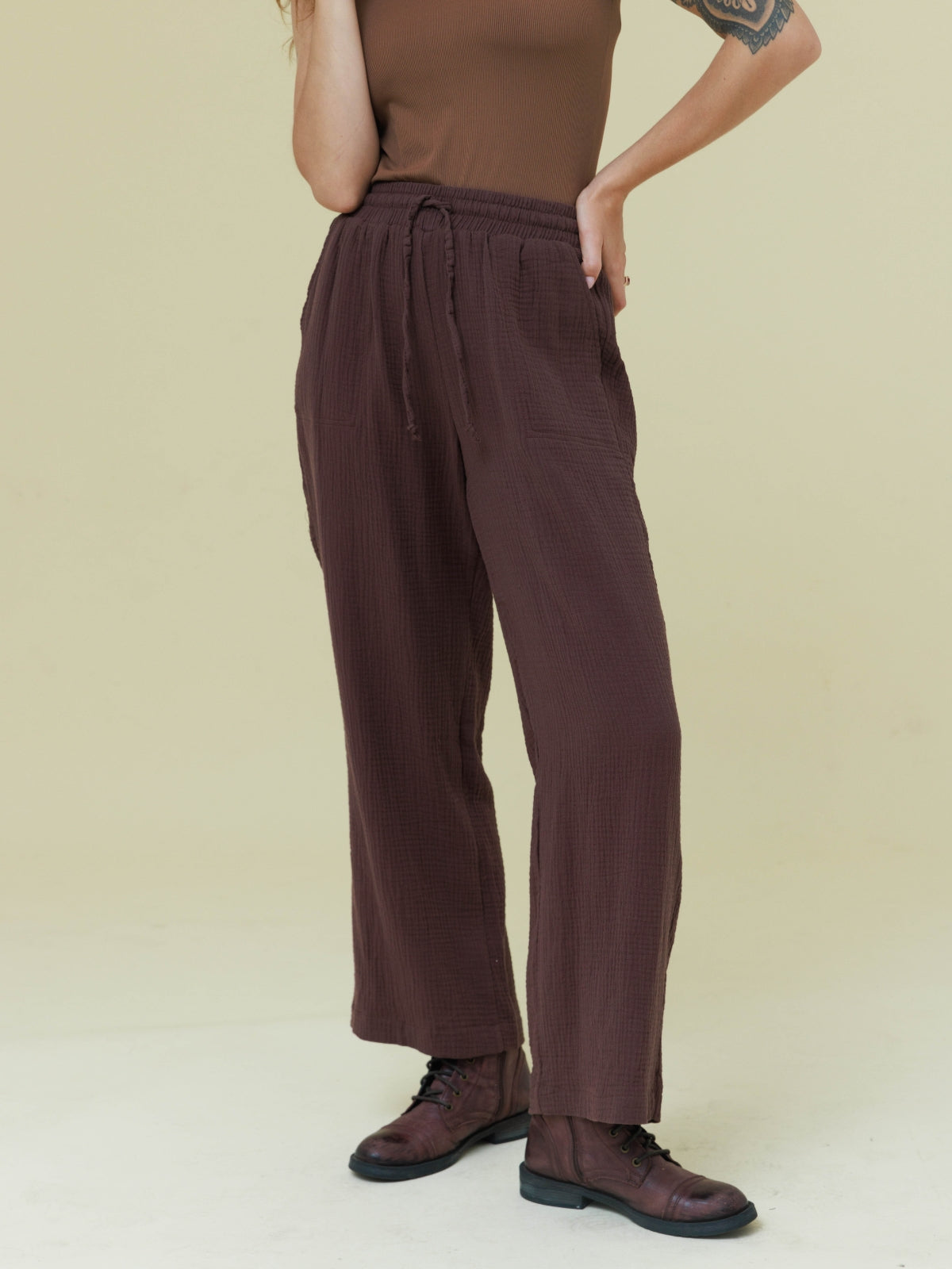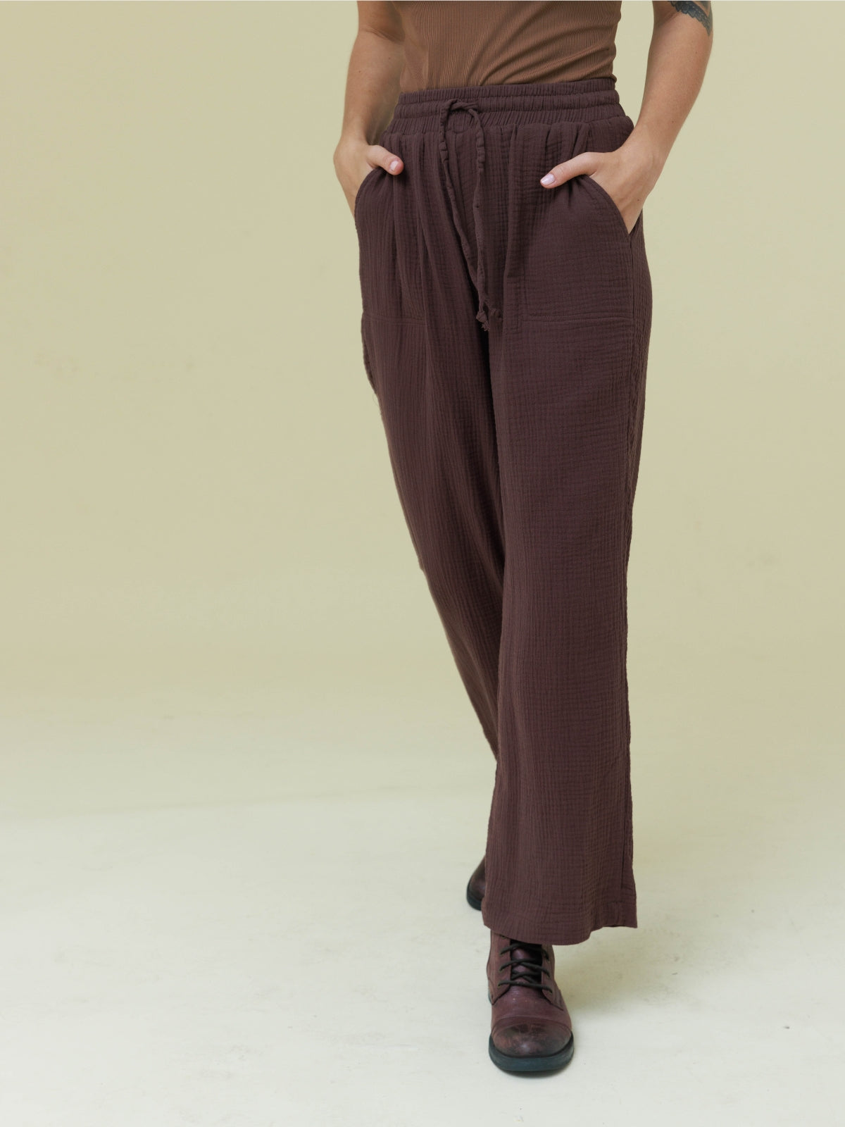 מכנסיים מבד טטרה כותנה קלילים ונעימים. המכנסיים עם גומי במותן בעל מתיחה רבה. הפריט בגזרה רחבה ונוחה. לפריט כיסים בצדי המכנסיים. הפריט המושלם למראה קז'ואל קייצי. מהמם ללבישה עם שילובים רבים