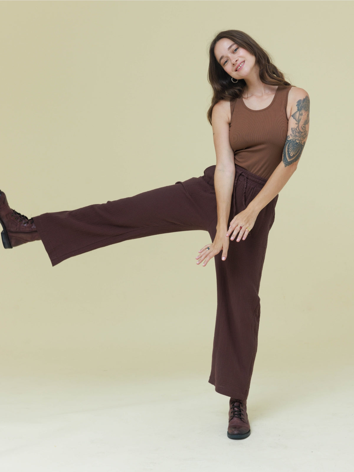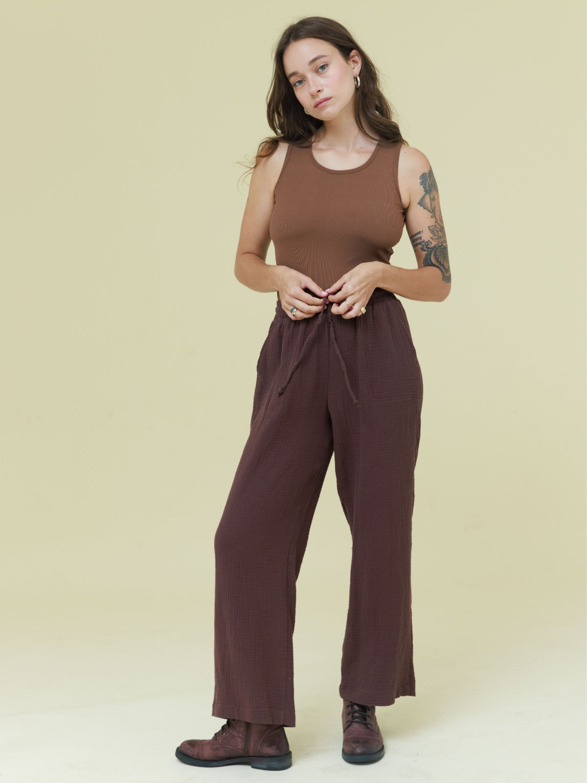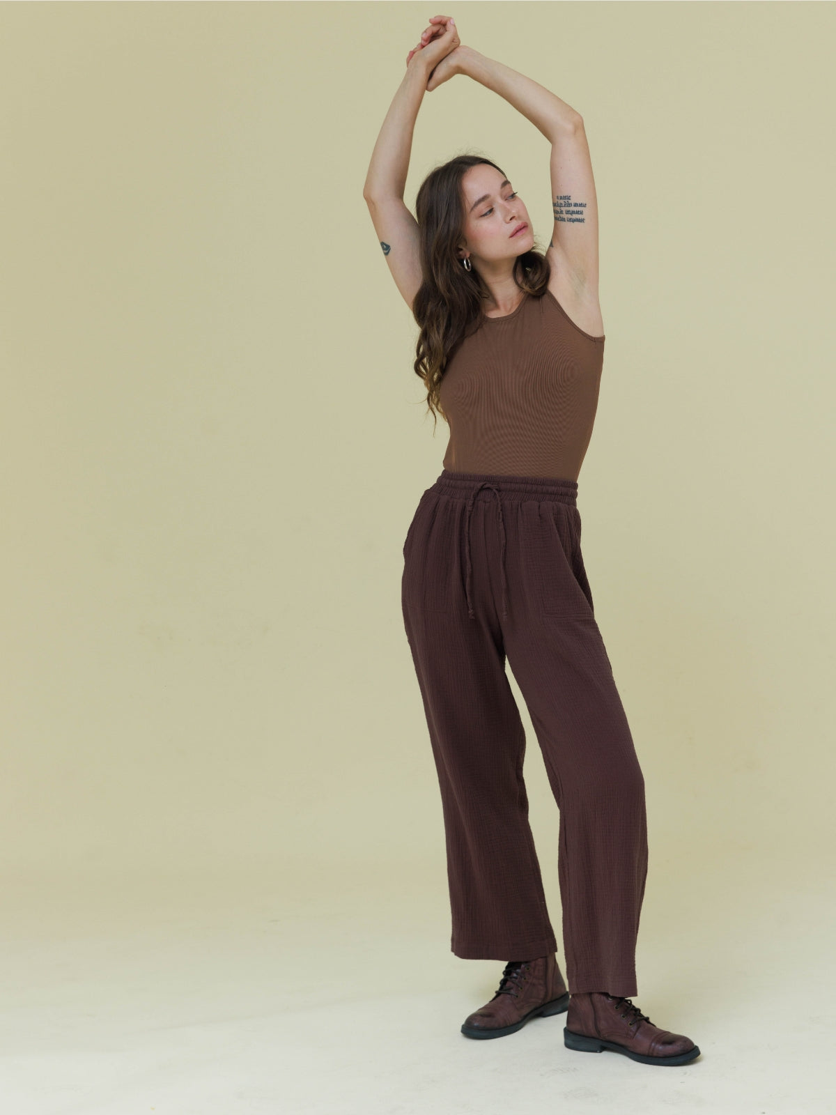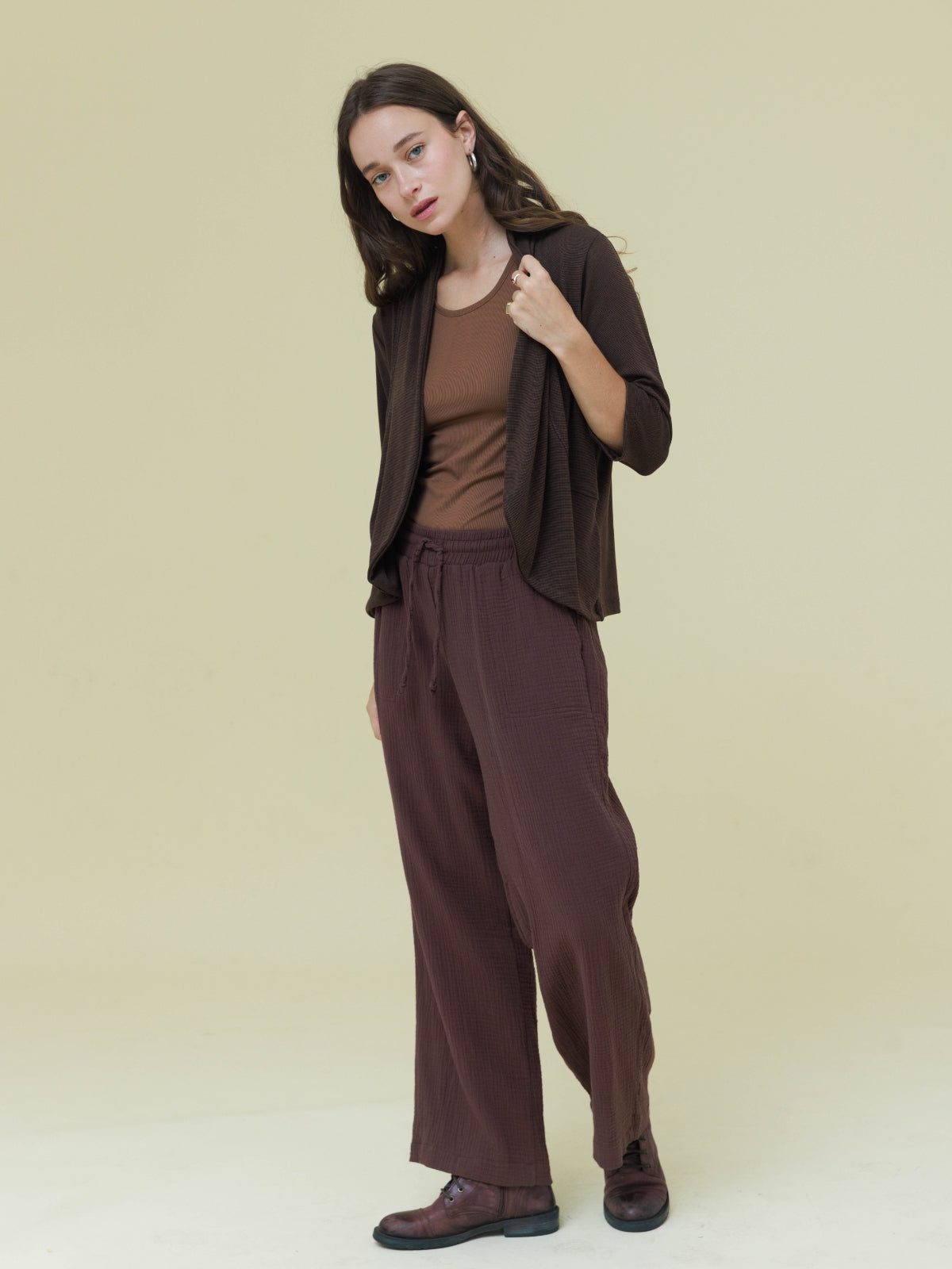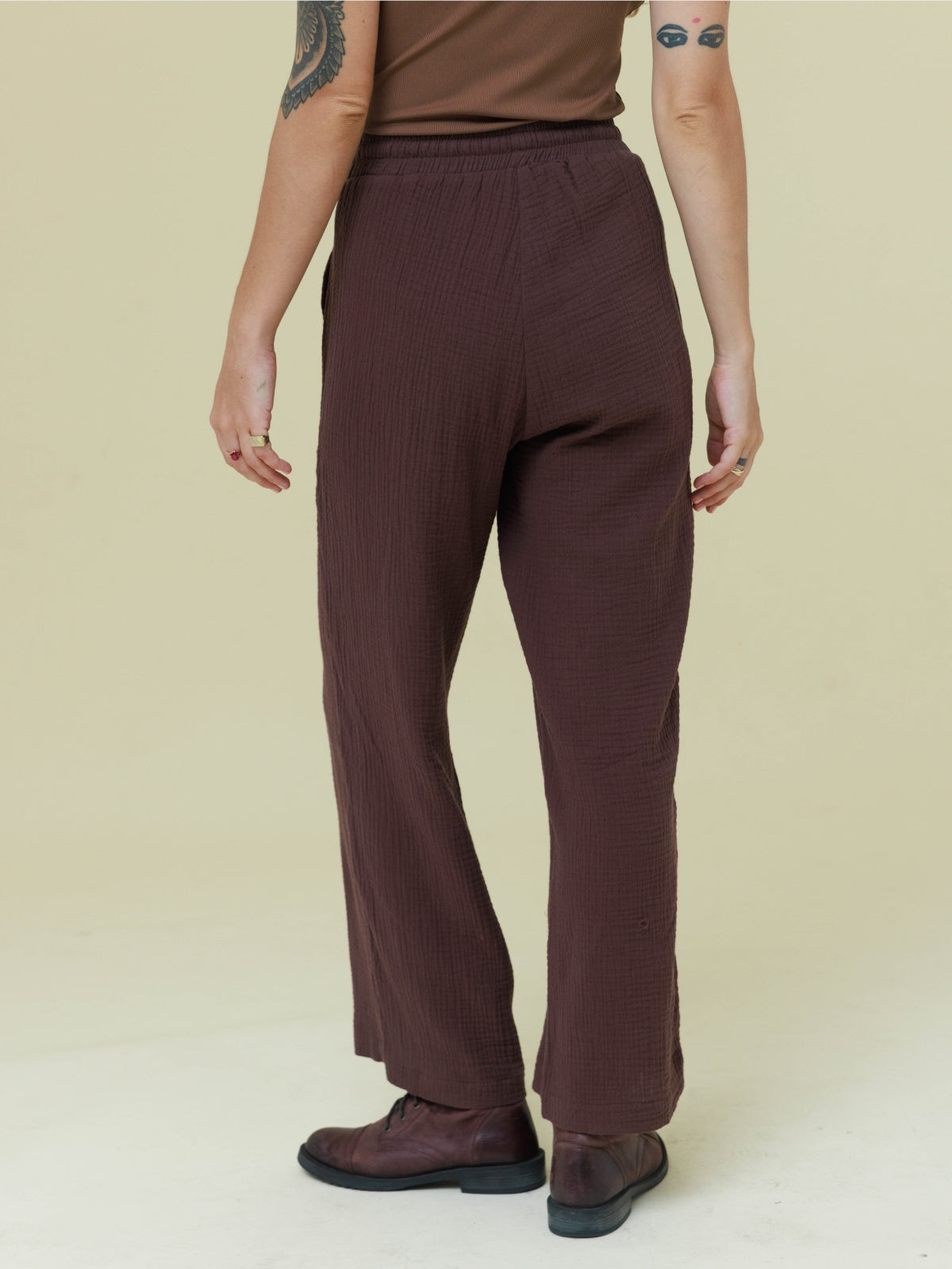 מכנסיים מבד טטרה כותנה קלילים ונעימים. המכנסיים עם גומי במותן בעל מתיחה רבה. הפריט בגזרה רחבה ונוחה. לפריט כיסים בצדי המכנסיים. הפריט המושלם למראה קז'ואל קייצי. מהמם ללבישה עם שילובים רבים